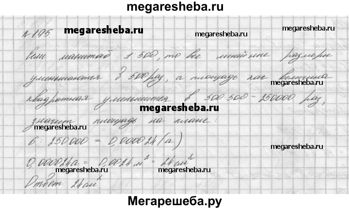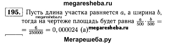 195. Площадь земельного участка прямоугольной формы 6 а. Найдите площадь прямоугольника, изображающего этот участок на плане, масштаб которого 1: 500.
