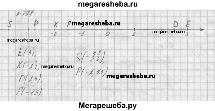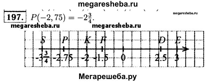 197. Начертите координатную прямую, приняв за единичный отрезок длину четырех клеток тетради. Отметьте на этой прямой Е(3), К(-2), D(2,5), F(-1,5), S (-3*3/4), Р(-2,75).