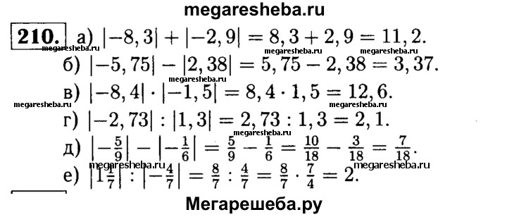 210. Найдите значение выражения: а) |-8,3 | + |-2,9 |; б) | -5,75 | - | 2,38 |; в) | -8,4 | * | -1,5 |; г) | -2.73 | : | 1,3 |; д) | -5/9 | - | -1/6 |; е) | 1*1/7 | : | -4/7 |.