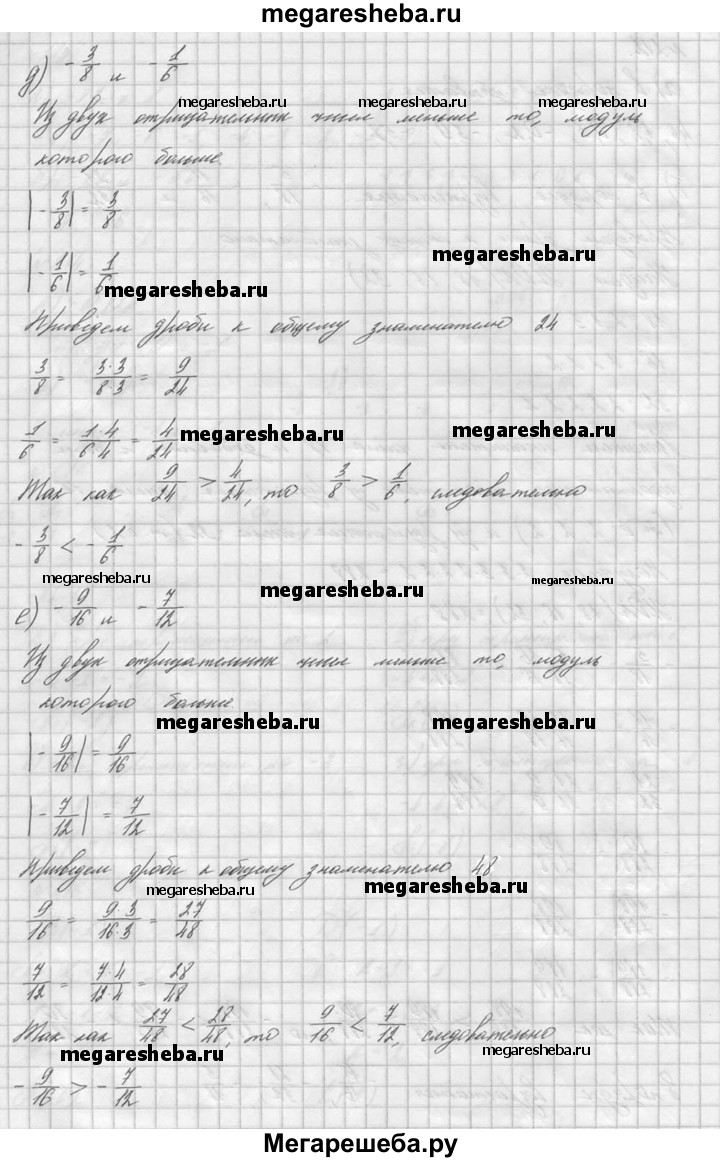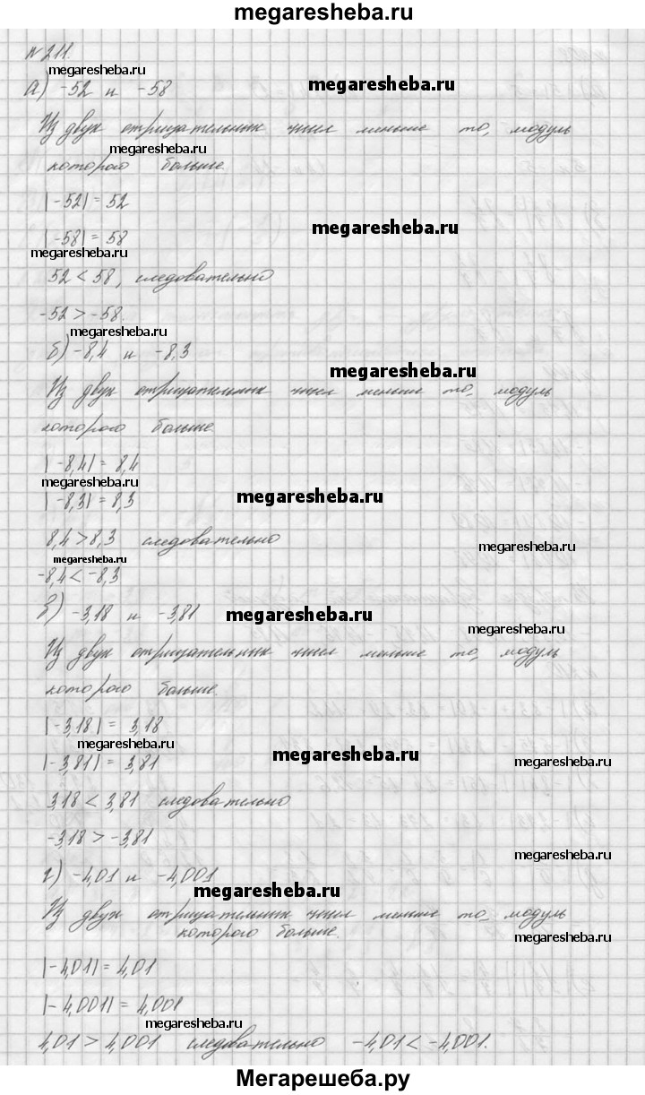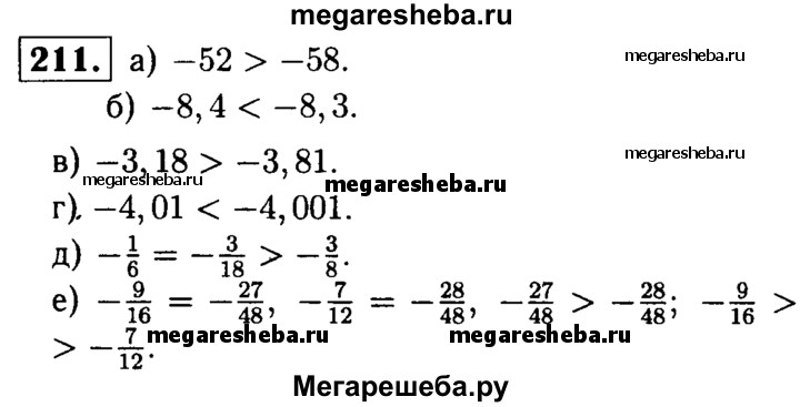 211. Сравните: а) -52 и -58; б) -8,4 и -8,3; в) -3,18 и -3,81; г) -4,01 и -4,001; д) -3/8 и -1/6; е) -9/16 и -7/12.