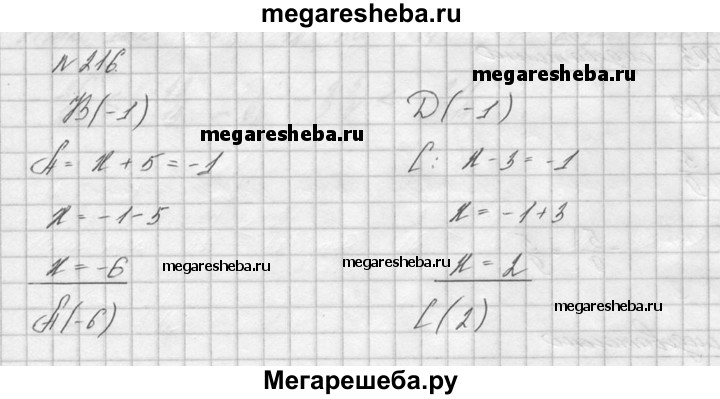216. Точка А при перемещении на 5 перешла в точку В (-1), а точка С при перемещении на -3 перешла в точку D (-1). Найдите координаты точек А и С.