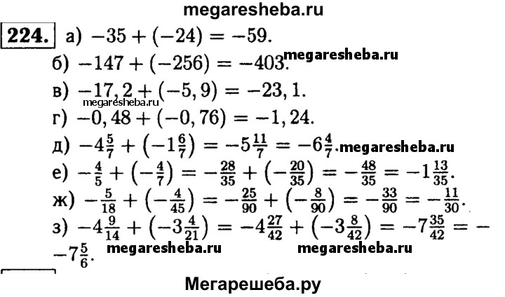 224. Найдите значение суммы: а) -35 + (-24); б) -147 + (-256); в) -17,2 + (-5,9); г) -0,48 + (-0,76); д) -4*5/7 + (-1*6/7); е) -4/5 +( -4/7); ж) -5/18 + (-4/45); з) -4*9/14 + (-3*4/21).