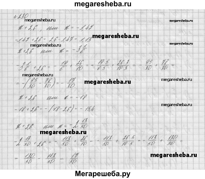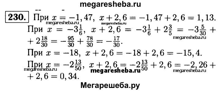 230. Найдите значение выражения х + 2,6, если х = -1,47; х = -3*1/6; х = -18; х =- 2*13/50.