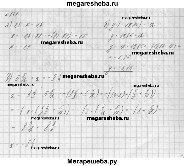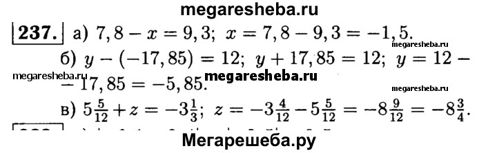 237. Решите уравнение: а) 7,8 - х = 9,3; б) у - (-17,85) = 12; в) 55/12 + z = - 3*1/3.