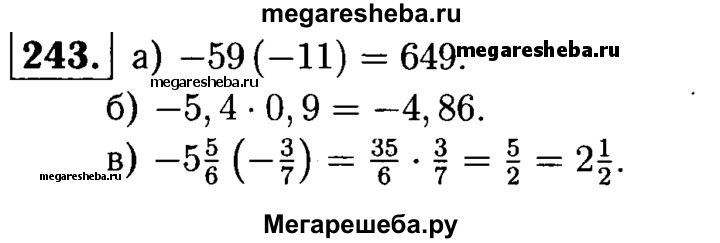 243. Выполните умножение: а) -59(-11); б) -5,4 -0,9; в) -5*5/6(-3/7).