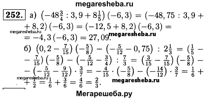 252. Найдите значение выражения: a) (-483/4 : 3,9 + 8*1/5)(-6,3); б) (0,2 – 7/15)(-5/8) – (-5/12 – 0,75): 2-1/3.