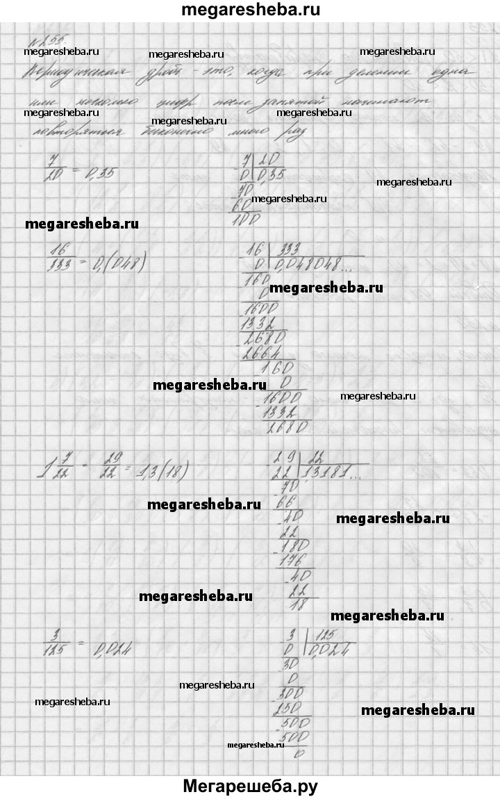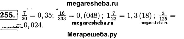 255. Выразите в виде десятичной или периодической дроби числа 7/20, 16/333, 1*7/22, 3/125.