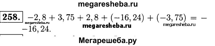 258. Сложив сначала противоположные числа, найдите значение выражения -2,8 + 3,75 + 2,8 + (-16,24) + (-3,75).
