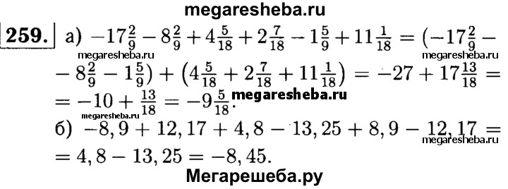 259. Найдите значение выражения: а) -17*2/9 – 8*2/9 + 4*5/18 + 2*7/18 – 1*5/9 +11*1/18 б) -8,9 + 12,17 + 4,8 - 13,25 + 8,9 - 12,17.