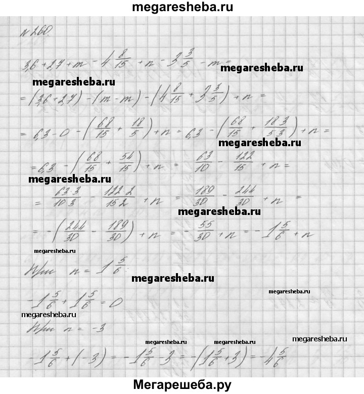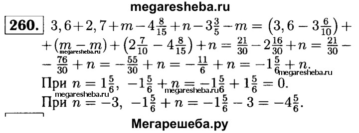 260. Упростите выражение 3,6 + 2,7 + m – 4*8/15 + n – 3*3/5 – m и найдите его значение при n = 1*5/6 и n = -3.