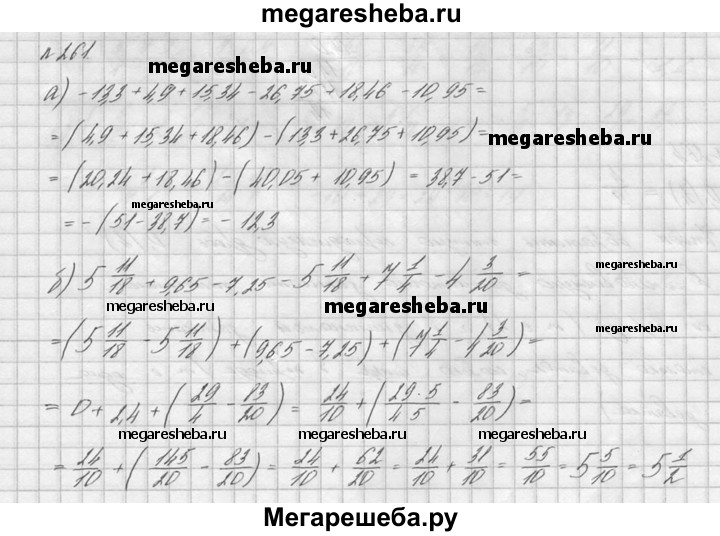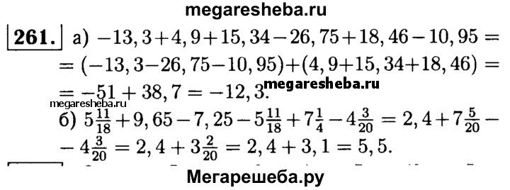 261. Найдите значение выражения: а) -13,3 + 4,9 + 15,34 - 26,75 + 18,46 - 10,95; б) 5*11/18 + 9,65 - 7,25 – 5*11/18 + 7*1/4 – 4*3/20.