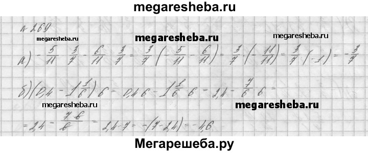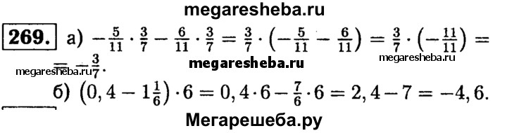 269. Найдите значение выражения, применив распределительное свойство умножения: а) -5/11 * 3/7 – 6/11 * 3/7; б) (0.4 – 1*1/6)6.