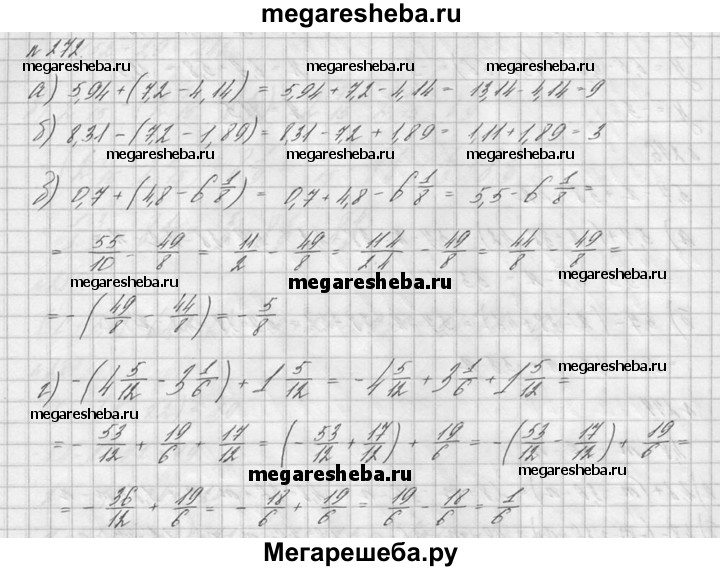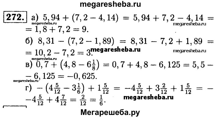 272. Раскройте скобки и найдите значение выражения: а) 5,94 + (7,2 - 4,14); б) 8,31 - (7,2 - 1,89); в) 0,7 + (4,8 - 6*1/8); г) -(4*5/12 – З*1/6) + 1*5/12.