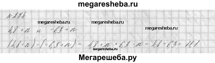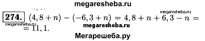274. Составьте разность выражений 4,8 + n и -6,3 + n и упростите ее.