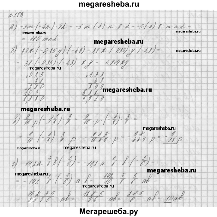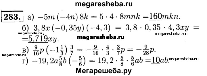 283. Упростите выражение и подчеркните коэффициент: а) -5m(-4n)8k; б) 3,8х(-0,35y)(-4,3); в) 9/16p(-1*1/3)3/7; г) -19,2а5/8b(-5/6).