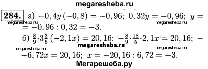 284. Решите уравнение: а) -0,4y(-0,8) = -0,96 ; б) 8/9 * 3*3/5(-2,1х) = 20,16.