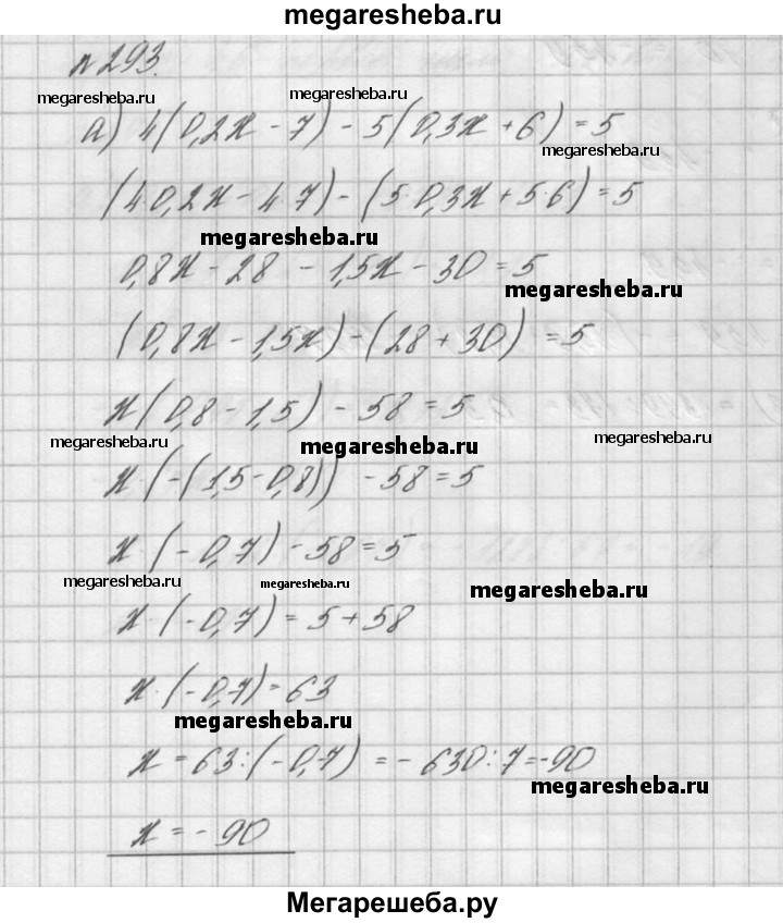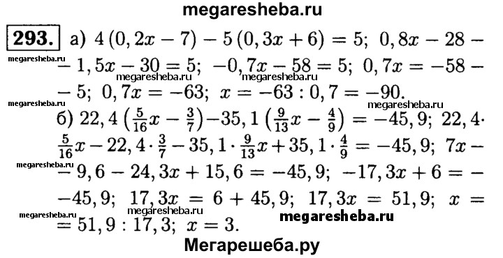 293. Найдите корень уравнения: а) 4(0,2x - 7) - 5(0,3x + 6) = 5; б) 22,4х(5/6x – 3/7) - 35,1 (9/13х – 4/9) = - 45,9.