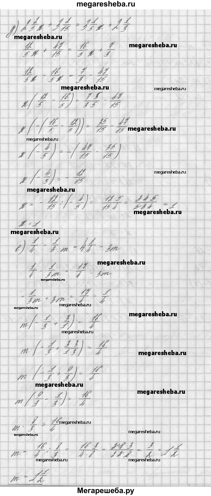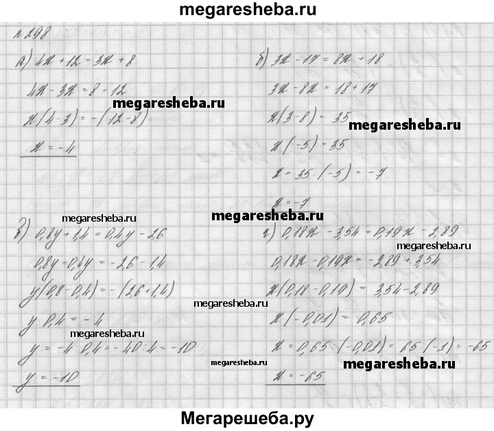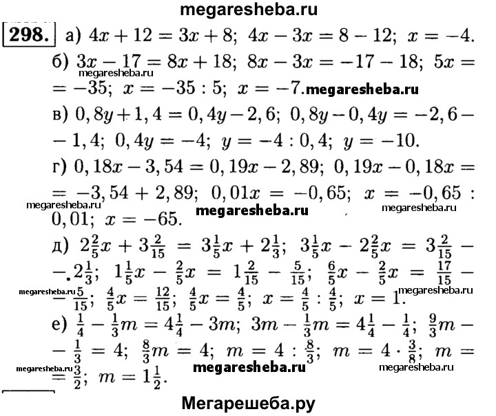 298. Решите уравнение: а) 4х + 12 = Зх + 8; б) Зx - 17 = 8х + 18; в) 0,8у + 1,4 = 0,4у - 2,6; г) 0,18x- 3,54 = 0,19x - 2,89; д) 2*2/5х + 3*2/15 = 3*1/5x + 2*1/3; е) 1/4 – 1/3m = 4*1/4 - Зm.