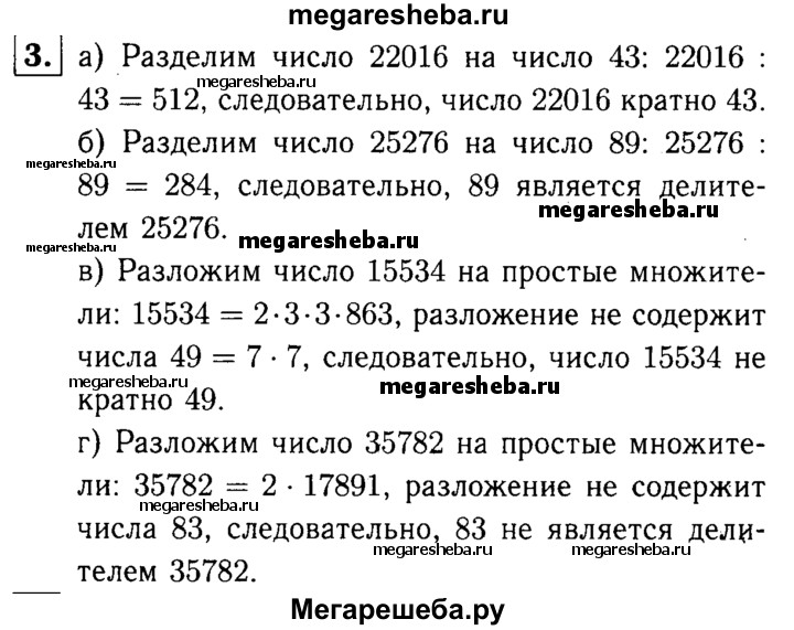 3. Докажите, что: а) 22 016 кратно 43; б) 89 является делителем 25 276; в) 15 534 не кратно 49; г) 83 не является делителем 35 782.