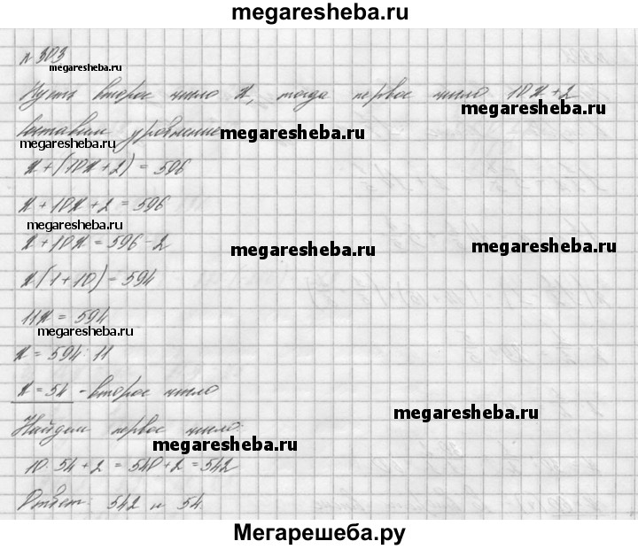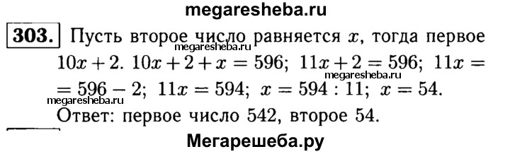 303. Сумма двух натуральных чисел 596. Одно из них оканчивается цифрой 2. Если эту цифру зачеркнуть, то получится _ второе число. Найдите эти числа.