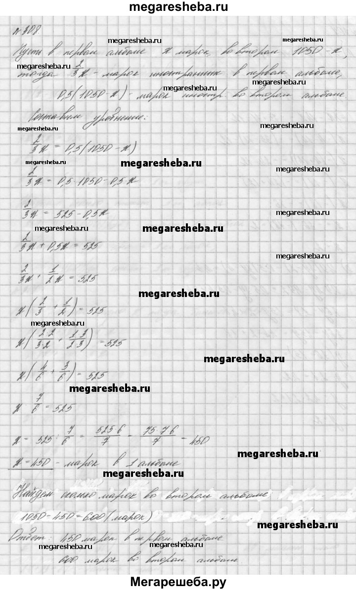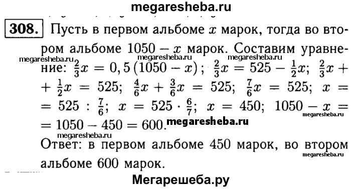 308. В двух альбомах 1050 марок. В первом альбоме иностранные марки составляют 2/3 всех имеющихся там марок, а во втором альбоме иностранные марки составляют 0,5 всех марок этого альбома. Сколько марок в каждом альбоме, если число иностранных марок и в том, и в другом альбоме одинаково?