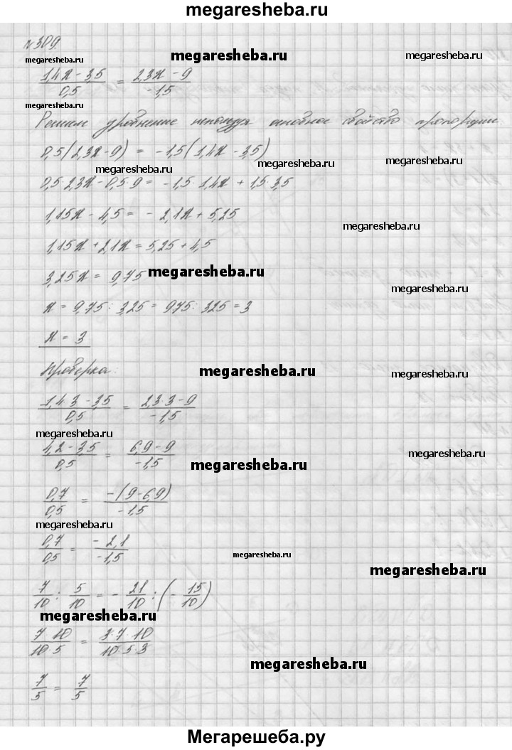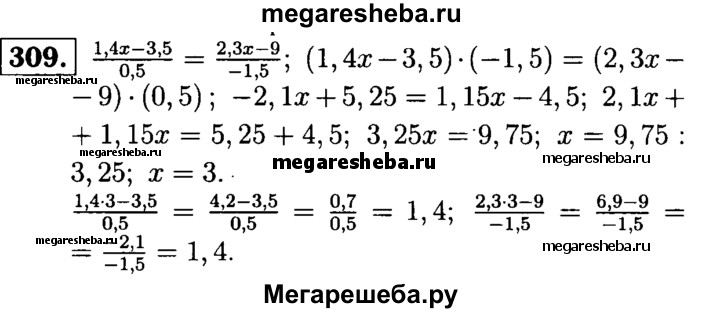 309. Решите уравнение 1,4х – 3,5 / 0,5 = 2,3х – 9 / -1,5 и выполните проверку.
