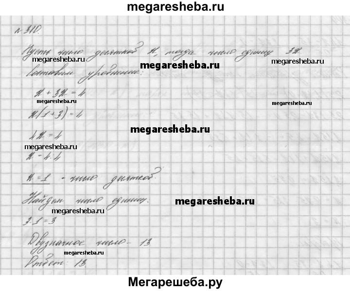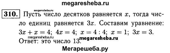 310. В двузначном натуральном числе сумма цифр равна 4, число десятков в 3 раза меньше числа единиц. Найдите это число.