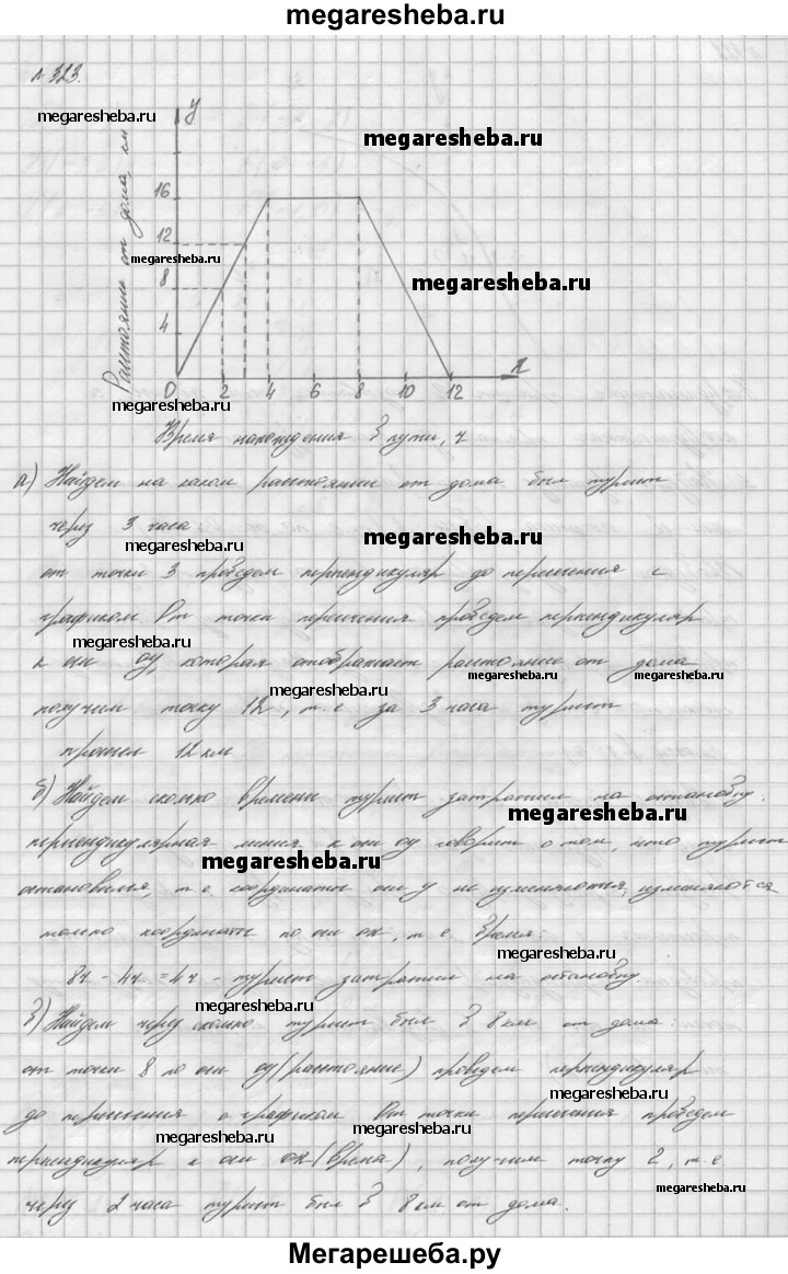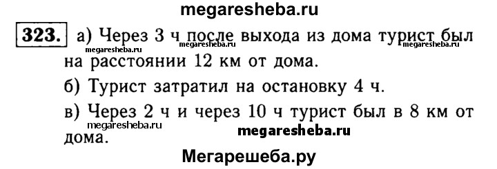 323. На рисунке 15 изображен график движения туриста. Рассмотрев график, ответьте на вопросы: а) На каком расстоянии от дома был турист через 3 ч после выхода из дома? б) Сколько времени турист затратил на остановку? в) Через сколько часов после выхода турист был в 8 км от дома?