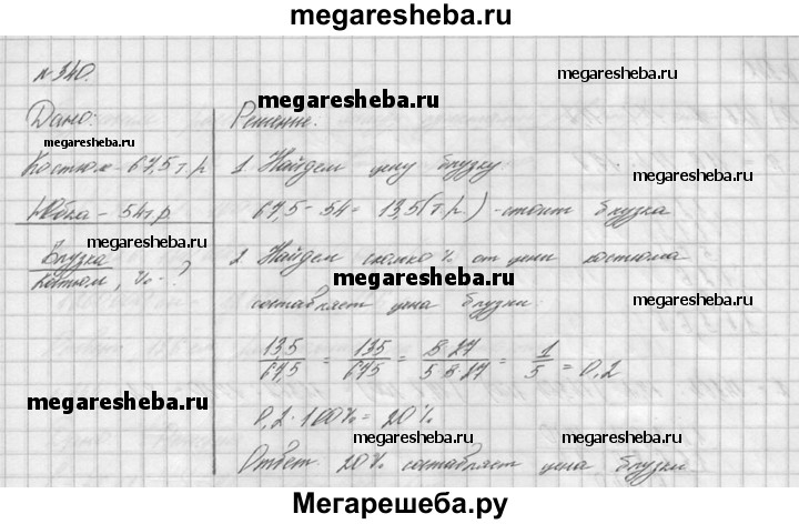 340. Женский костюм состоит из юбки и блузки. Цена костюма 67,5 тыс. рублей, а цена юбки 54 тыс. рублей. Сколько процентов от цены костюма составляет цена блузки?