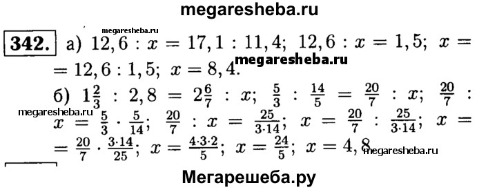 342. Решите уравнение: а) 12,6 : х = 17,1 : 11,4; б) 1*2/3 : 2,8 = 2*6/7 : х.