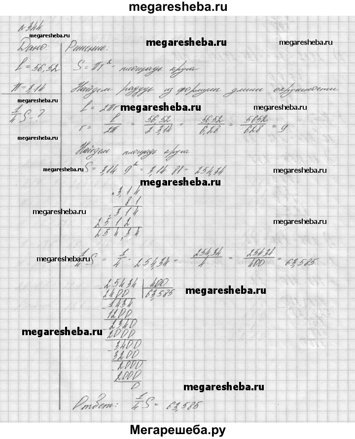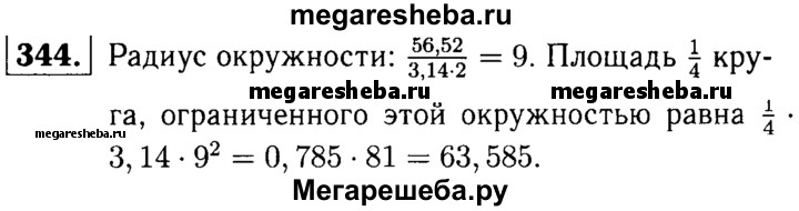 344. Длина окружности 56,52. Найдите площадь 1/4 круга, ограниченного этой окружностью. (Число π округлите до сотых.)