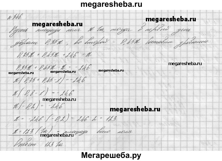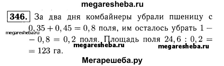 346. В первый день комбайнеры убрали пшеницу с 0,35 поля, во второй день — с 45% поля, а в третий день — с остальных 24,6 га. Какова площадь поля?