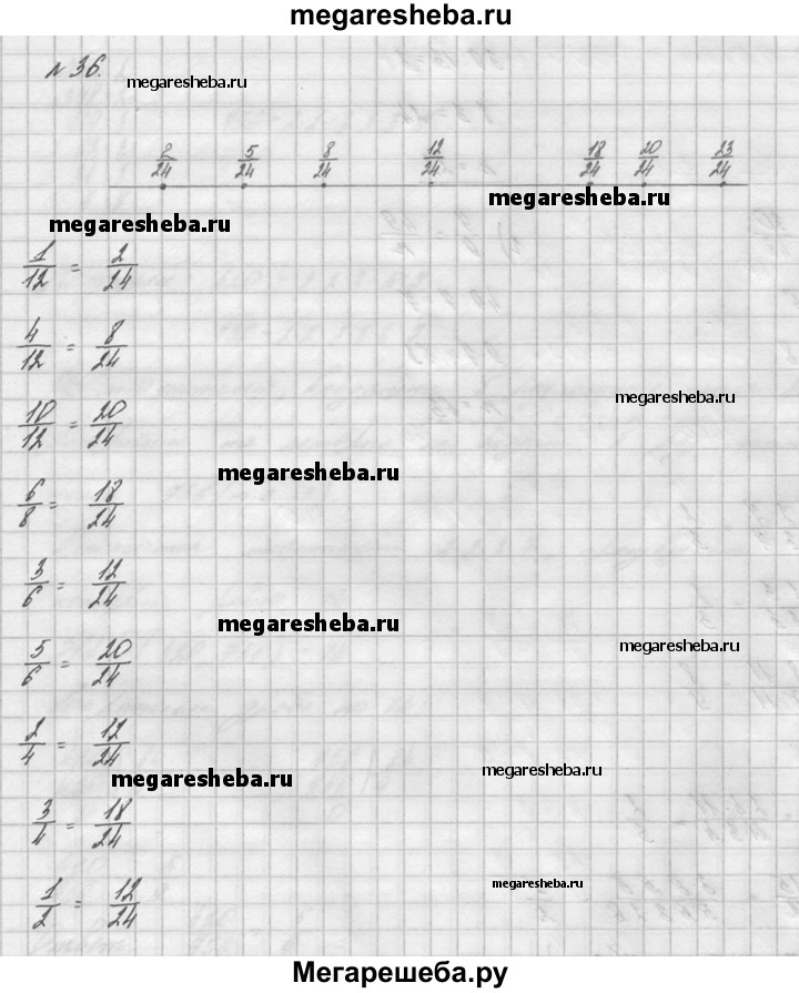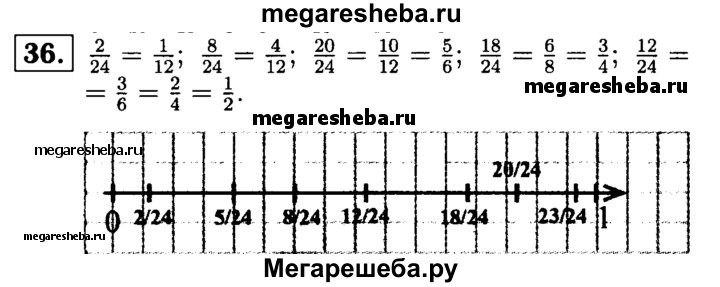 36. Начертите координатный (числовой) луч, приняв за единичный отрезок длину 24 клеток тетради. Отметьте на луче точки с координатами 2/24, 5/24 ,8/24, 12/24, 18/24, 20/24, 23/24, 1/12, 4/12, 10/12, 6/8, 3/6, 5/6, 2/4, 3/4, 1/2. Какие из этих чисел изображаются на координатном луче одной и той же точкой? Напишите соответствующие равенства.