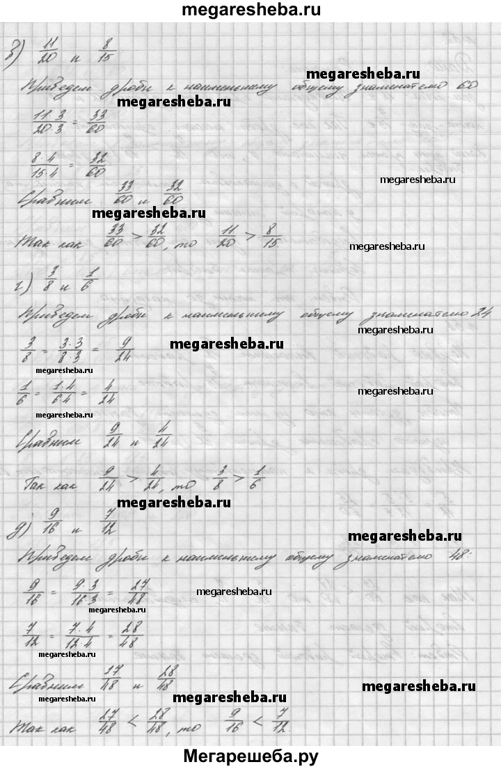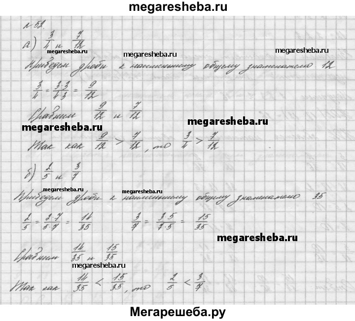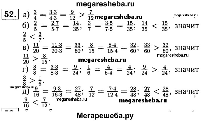 52. Сравните дроби: а) 3/4 и7/12; б) 2/5 и 3/7; в) 11/20 и 8/15; г) 3/8 и 1/6 ; д) 9/16 и 7/12.