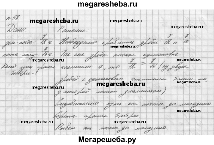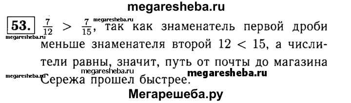 53. Сережа на дорогу от дома до почты затратил 7/12 ч, а на дорогу от почты до магазина 7/15ч. Какой путь Сережа прошел быстрее: от дома до почты или от почты до магазина?