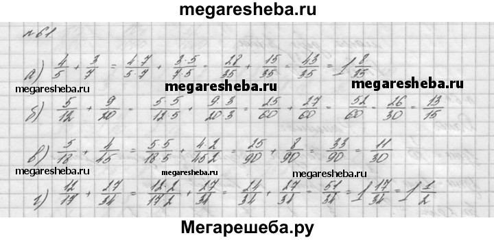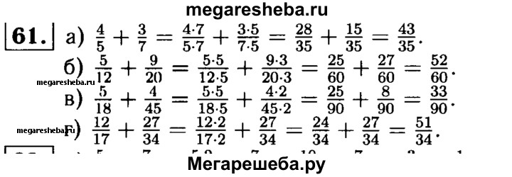 61. Выполните сложение: а) 4/5 + 3/7; 6) 5/12 + 9/20; в) 5/18 + 4/45; г) 12/17 + 27/34.