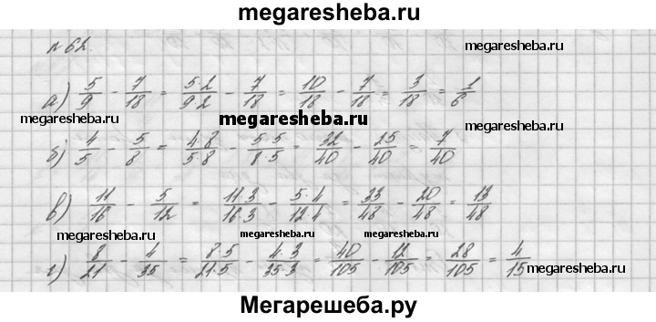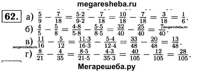 62. Выполните вычитание: а) 5/9 – 7/18; б) 4/5 – 5/8; в) 11/16- 5/12; г) 8/21 – 4/35.