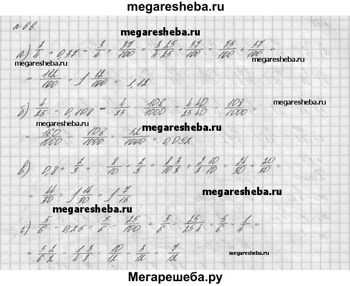 66. Выполните действие: а) 3/4 + 0,37; б) 4/25 - 0,108; в) 0,8 + 2/3; г) 5/6 – 0,25.
