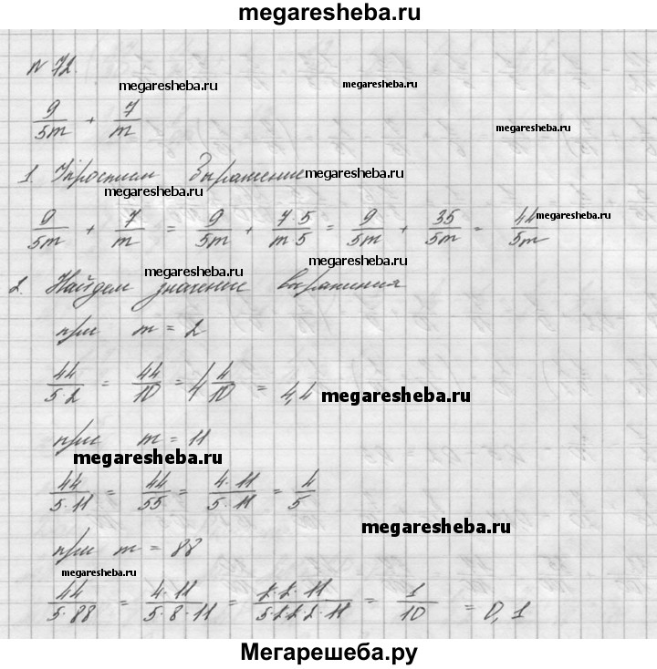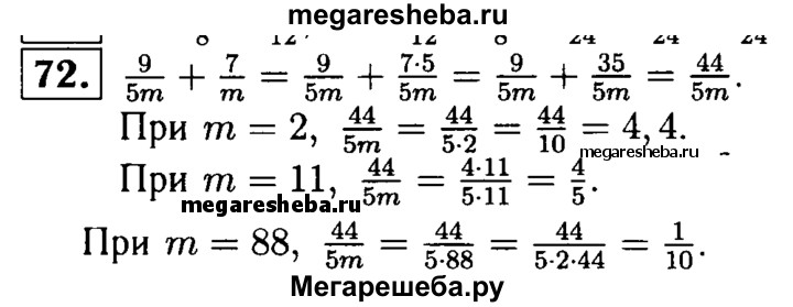 72. Упростите выражение 9/5m + 7/m и найдите его значение при m = 2; m = 11 и m= 88.