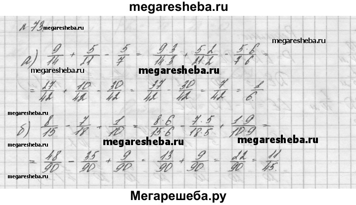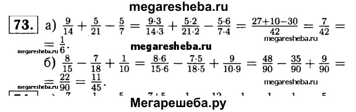 73. Найдите значение выражения: а) 9/14 + 5/21 – 5/7; б) 8/15 – 7/18 + 1/10.
