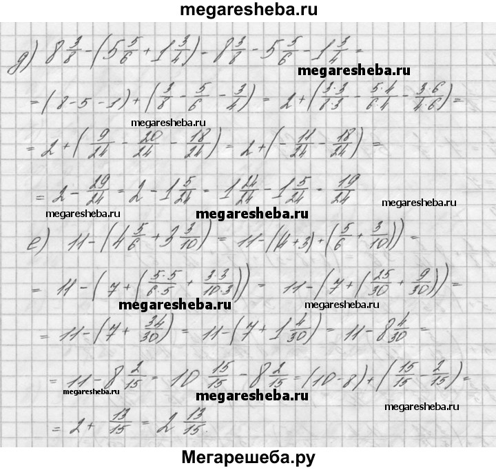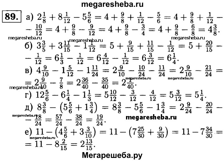 89. Найдите значение выражения: а) 2*18 + 8*1/12 – 5*5/6; б) 3*3/5 + 3*11/15 – 1*1/12; в) 4*9/10 – 1*5/12 – 1*11/24; г) 12*5/6 – 6*1/4 – 1*1/3; д) 8*3/8 – (5*5/6 + 1*3/4); е) 11-(4*5/6 + 3*3/10).