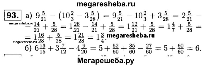 93. Выполните действия: а) 9*5/21 - (10*2/3 – 3*5/28); б) 6*13/15 + 3*7/12 – 4*9/20.