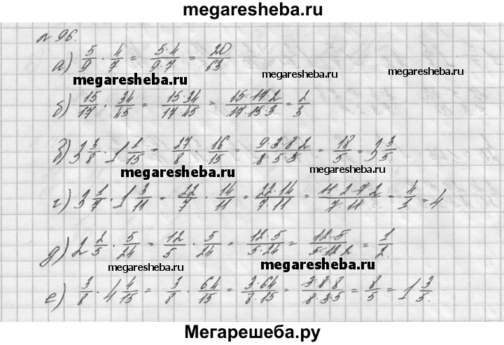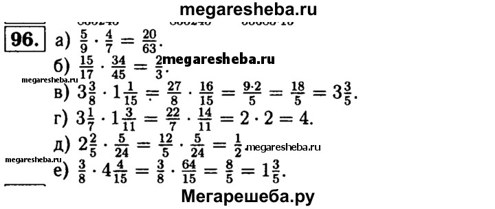 96. Выполните действие: а) 5/9 * 4/7; б) 15/17 * 34/45; в) 3*3/8 * 1*1/15; г) 3*1/7 * 1*3/11; д) 2*2/5 * 5/24; е) 3/8 * 4*4/15.