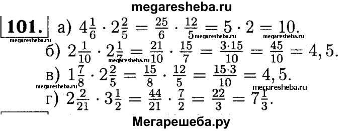 101. Выполните умножение: а) 4*1/6 * 2*2/5; б) 2*1/10 * 2*1/7; в) 1*7/8 * 2*2/5; г) 2*2/21 * 3*1/2.