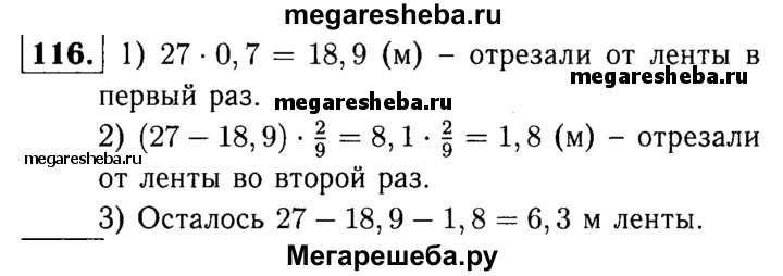 116. От ленты длиной 27 м сначала отрезали 0,7 ее длины, а потом 2/9 остатка. Сколько метров ленты осталось после этого?