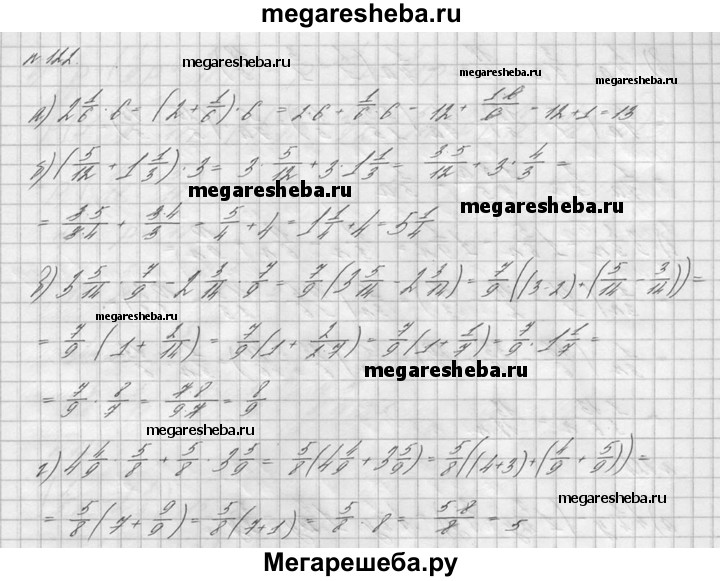 122. Использовав распределительный закон умножения, найдите значение выражения: а) 2*1/6 * 6; б) (5/12 + 1*1/3) * 3; в) 3*5/14 * 7/9 – 2*3/14 * 7/9; г) 4*4/9 * 5/8 + 5/8 * 3*5/9.