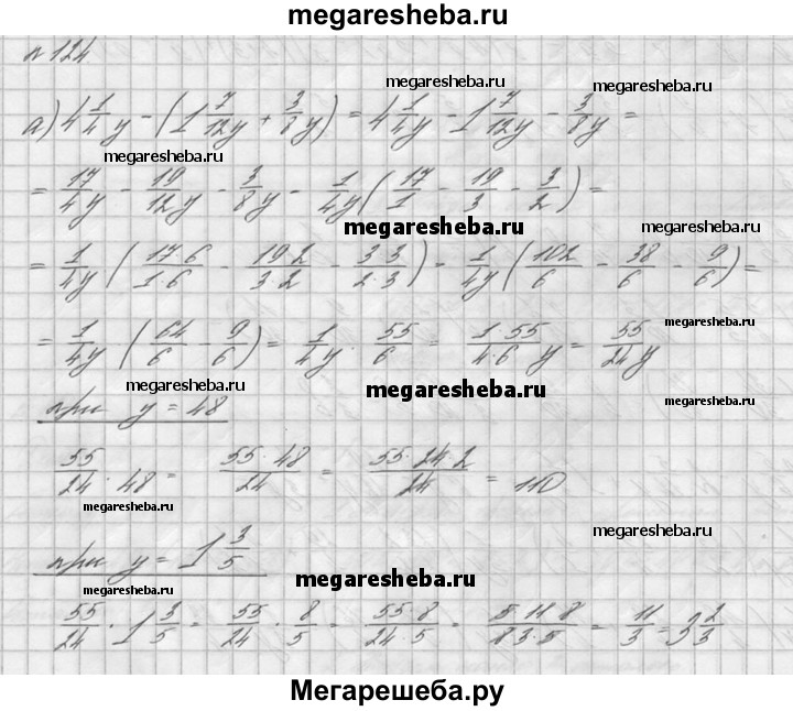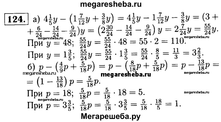 124. Найдите значение выражения: если a) 4*1/4y –(1*7/12y + 3/8y), если у = 48; у =13/5; б) p –(4/9p + 5/18p), если р = 18; р = 3*3/5.