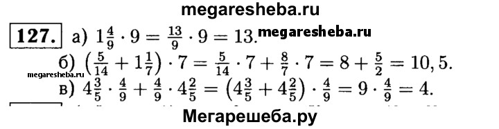 127. Найдите значение выражения: а) 1*4/9 * 9; б) (5/14 + 1*1/7) * 7; в) 4*3/5 * 4/9 + 4/9 * 4*2/5.