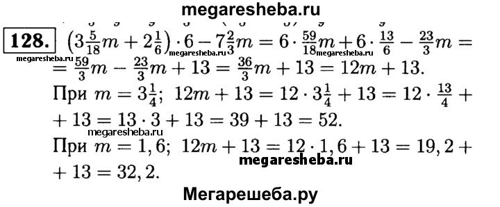 128. Найдите значение выражения: (3*5/18m + 2*1/6) * 6 -7*2/3m, если m = 3*1/4; m = 1,6.