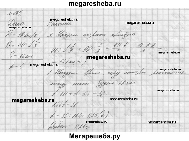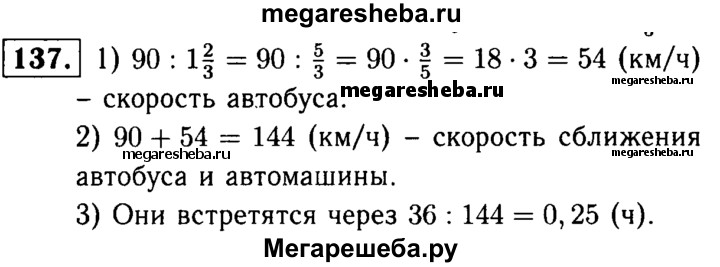 137. Автобус и легковая автомашина движутся навстречу друг другу. Скорость легковой автомашины 90 км/ч, а скорость автобуса в 1*2/3 раза меньше. Через сколько времени они встретятся, если сейчас между ними 36 км?